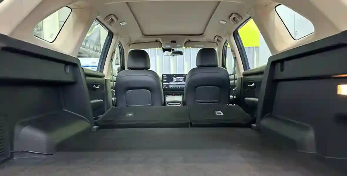 На втором ряду пятиместного варианта EVOLUTE i‑SPACE достаточный запас пространства. Также порадовали два дефлектора обдува на центральном тоннеле. Багажный отсек ранее исключительно 7-местного автомобиля впечатляет своей глубиной. Впрочем, боковины здесь не обиты войлоком и могут царапаться от перевозимых грузов. Кресла кроссовера складываются с соотношением 6-4. Полностью ровный пол не выходит – остаётся небольшая ступенька.